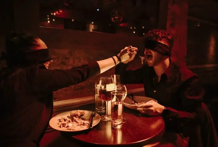 This night was to be our third night out. He’d blown me away with his planning for the first two. (He had a fucking famous museum opened for me and him privately, at night, so I could see an exhibition I had failed to secure tickets for….!!!!) This was my chance to impress him back. I thought it would be fun to go to a restaurant called Dinner in The Dark. A clever premise of a restaurant in pitch black, you literally cannot see a thing, where the waiters are blind, and the food is unconventional. The point being that when you lose one of your major senses, the others become heightened to compensate. So without your sight, your smell and taste are far more sensitive. You can really get lost in the flavors.